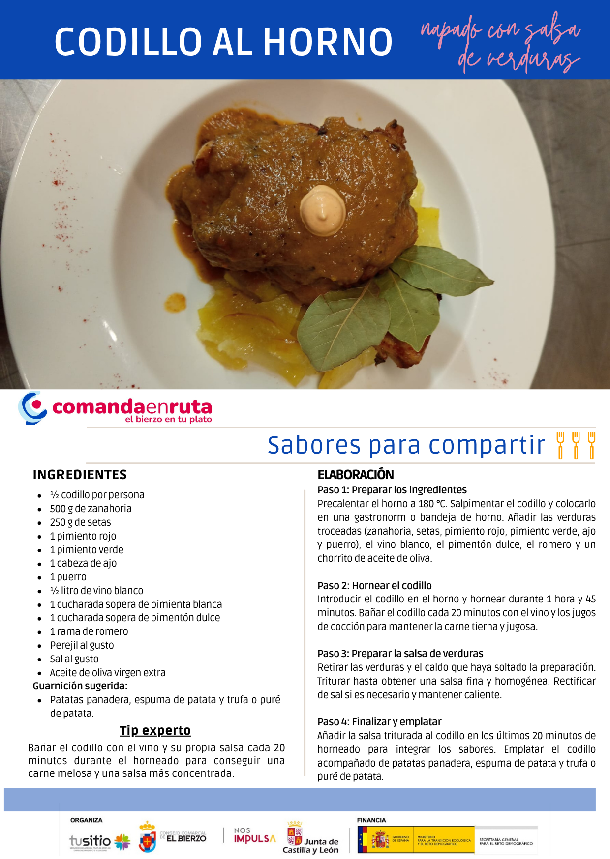 Añadir la salsa triturada al codillo en los últimos 20 minutos de horneado para integrar los sabores. Emplatar el codillo acompañado de patatas panadera, espuma de patata y trufa o puré de patata.